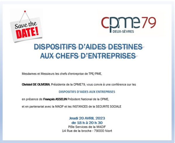 SAVE THE DATE : le 20 avril 2023 à 18h - Conférence "Dispositifs des aides aux entreprises"