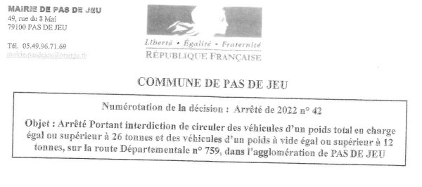 En effet, depuis début Janvier 2023, l’arrêté municipale N*42 portant sur l’interdiction de circuler des véhicules d’un poids total en charge égal ou supérieur à 26 Tonnes et des véhicules d’un poids à vide égale ou supérieur à 12 Tonnes, sur la route départementale N*759 dans l’agglomération de Pas-de-Jeu (79) est en vigueur.