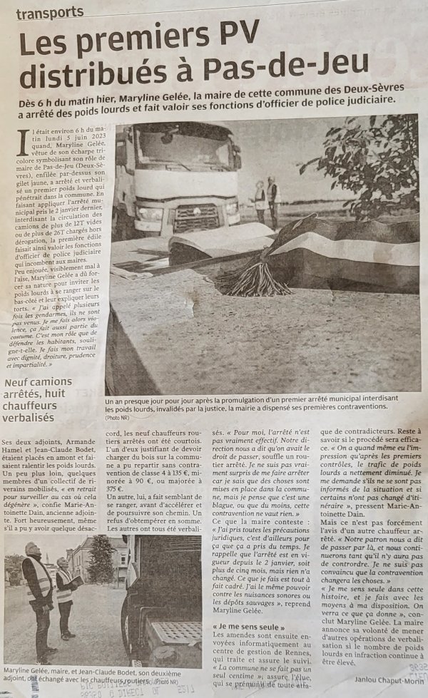 Neuf camions arrêtés, huit chauffeurs verbalisés lors de l’opération coup de poing menées Lundi 5 Juin 2023 dès 6h00 du matin par Maryline Gelée, maire de la commune de Pas-de-Jeu (79).